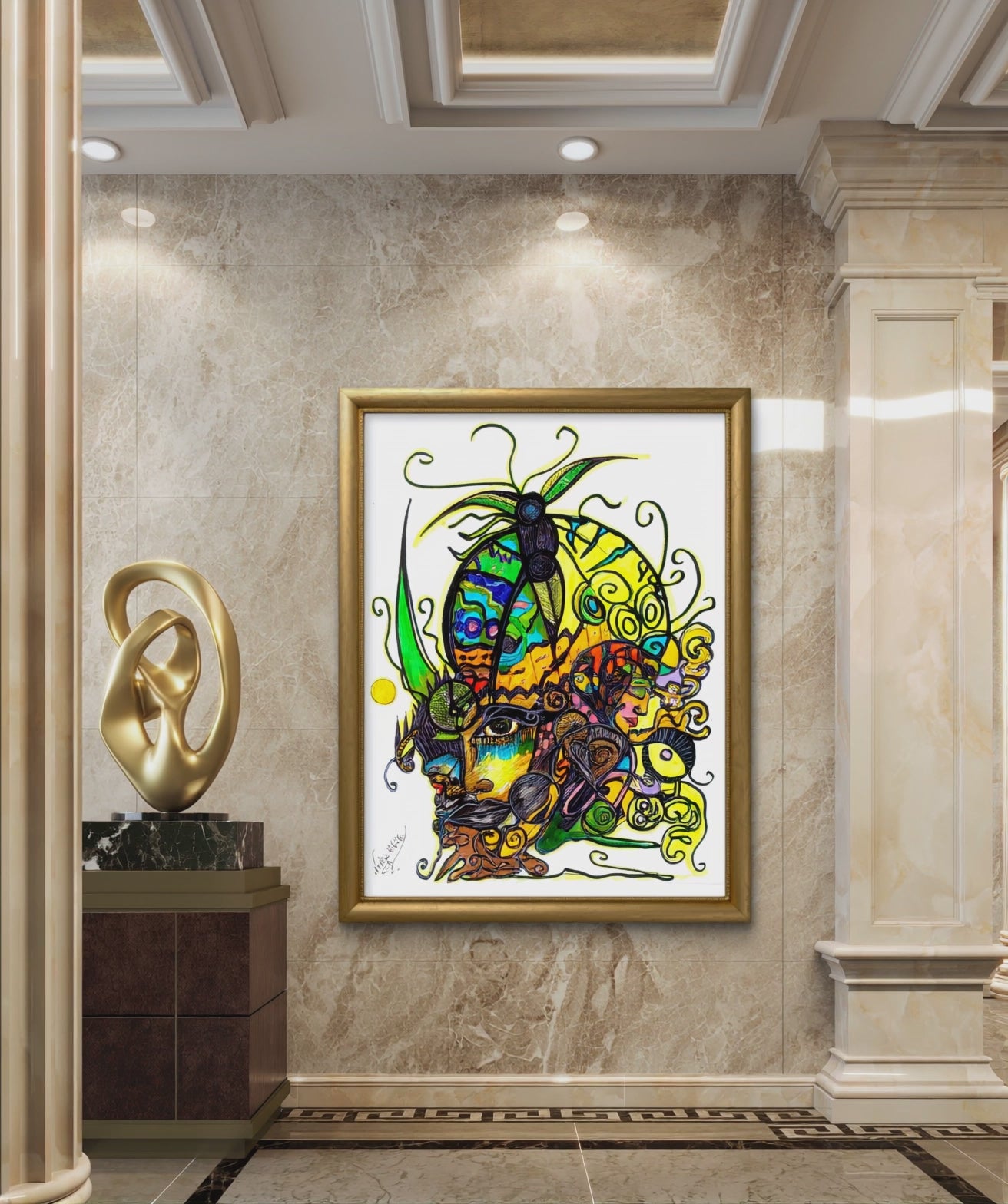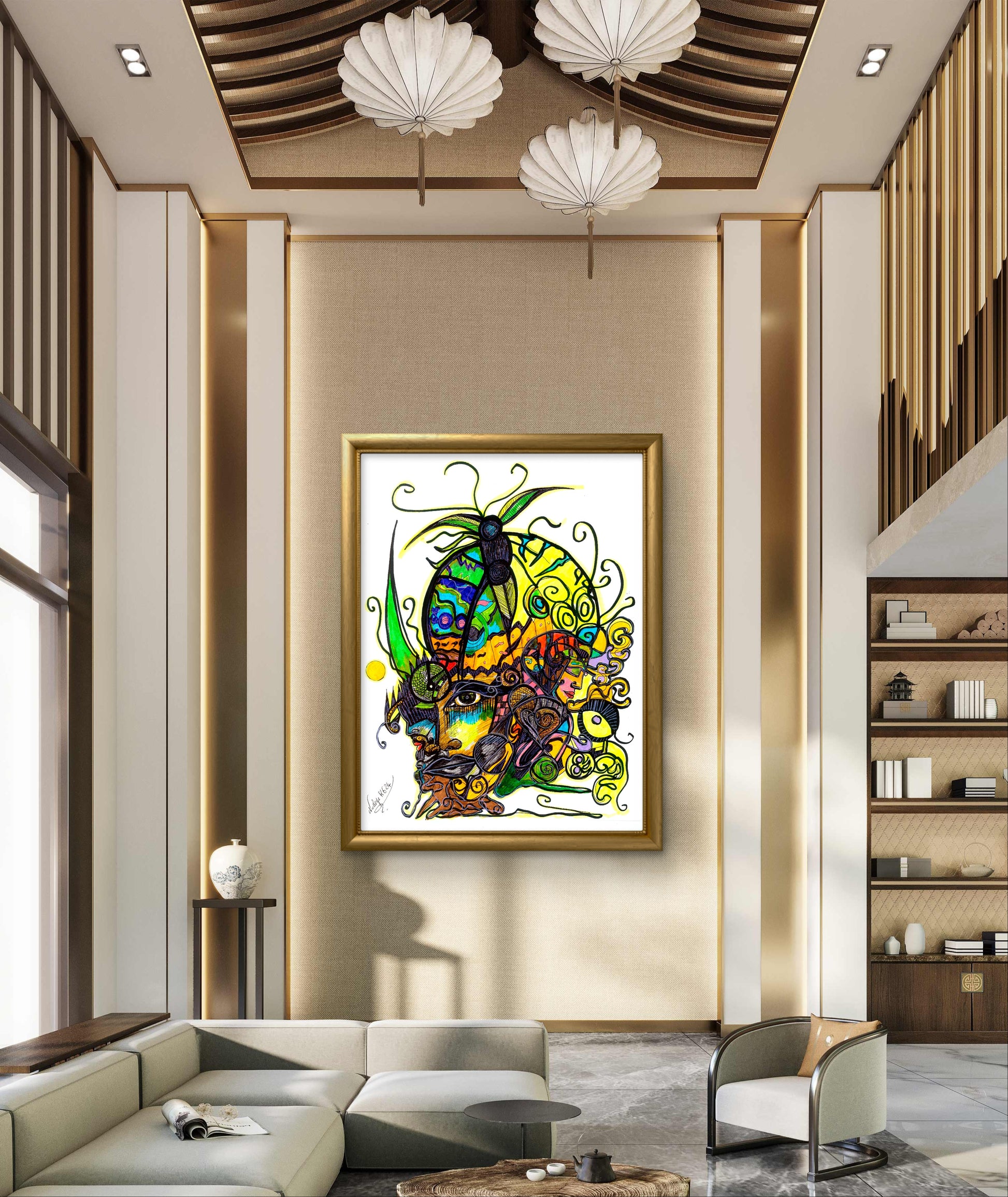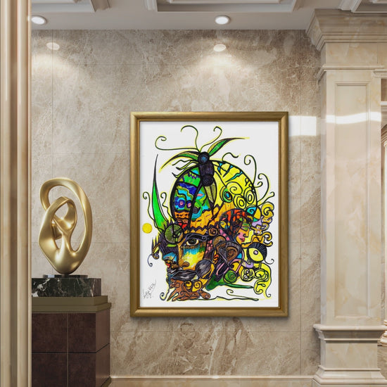 This stunning piece of artwork showcases a dynamic interplay of vibrant greens, yellows, and reds, meticulously complemented by intricate black linework. The artist’s bold palette infuses the artwork with a sense of liveliness while maintaining a grounded energy. The serene expression of the central figure, paired with the natural motifs, encourages viewers to reflect on their own connection to nature and the grounding power it provides.