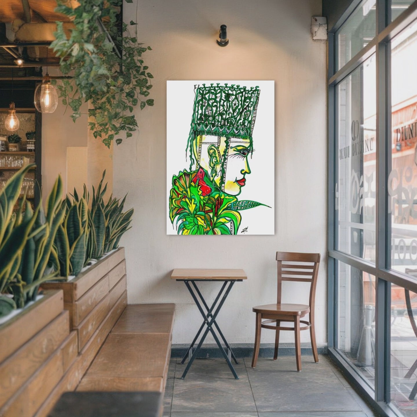 This stunning piece of artwork showcases a dynamic interplay of vibrant greens, yellows, and reds, meticulously complemented by intricate black linework. The artist’s bold palette infuses the artwork with a sense of liveliness while maintaining a grounded energy. The serene expression of the central figure, paired with the natural motifs, encourages viewers to reflect on their own connection to nature and the grounding power it provides.