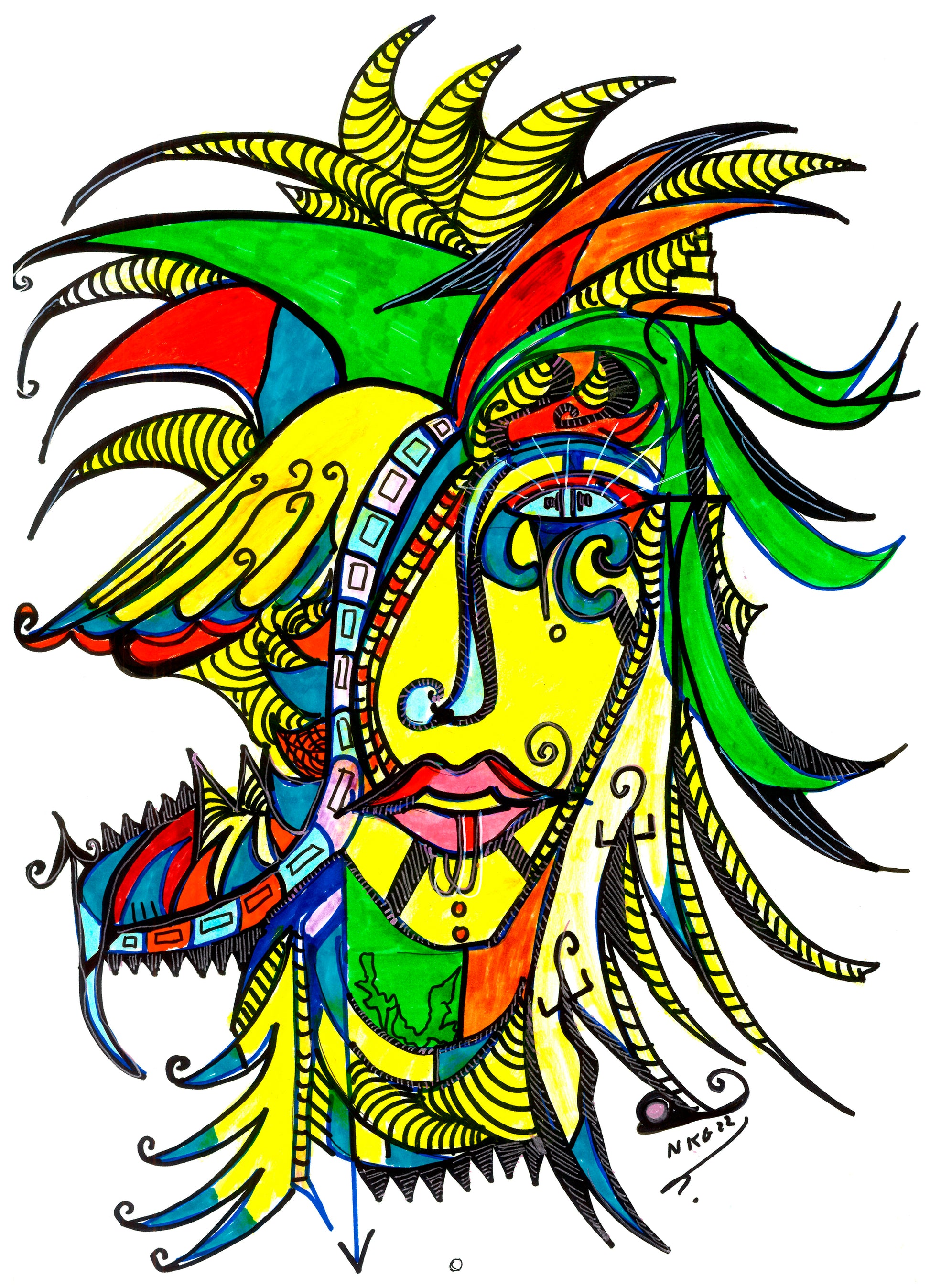 This stunning piece of artwork showcases a dynamic interplay of vibrant greens, yellows, and reds, meticulously complemented by intricate black linework. The artist’s bold palette infuses the artwork with a sense of liveliness while maintaining a grounded energy. The serene expression of the central figure, paired with the natural motifs, encourages viewers to reflect on their own connection to nature and the grounding power it provides.