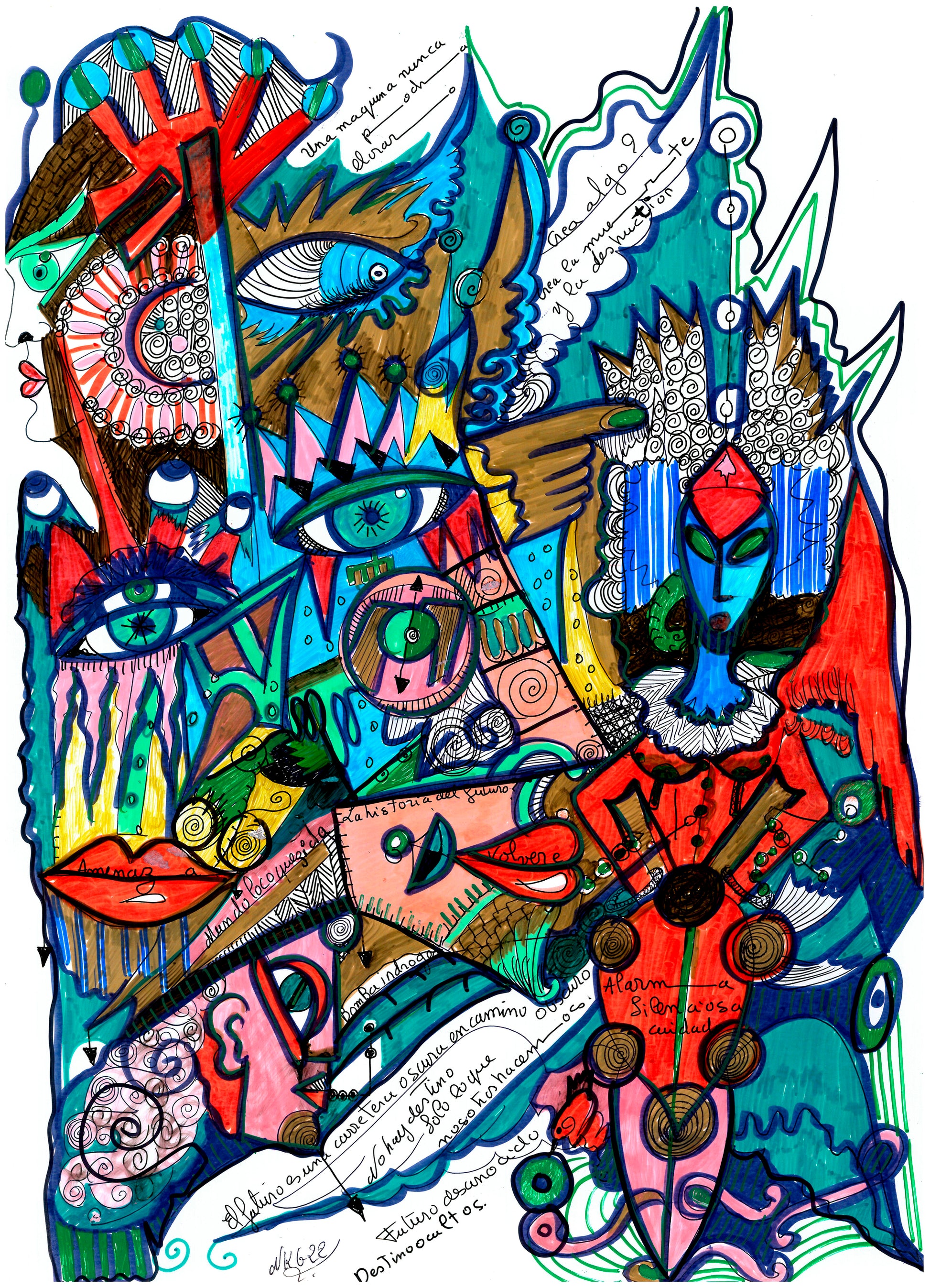 This stunning piece of artwork showcases a dynamic interplay of vibrant greens, yellows, and reds, meticulously complemented by intricate black linework. The artist’s bold palette infuses the artwork with a sense of liveliness while maintaining a grounded energy. The serene expression of the central figure, paired with the natural motifs, encourages viewers to reflect on their own connection to nature and the grounding power it provides.